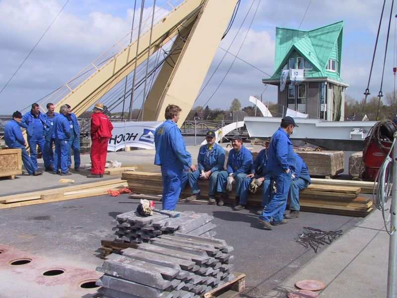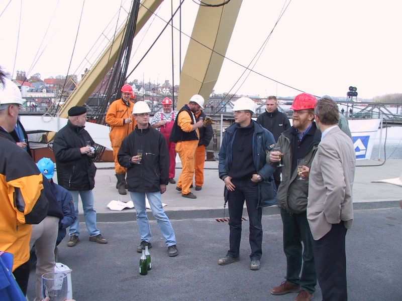 | 25.04.2002 - 13:51 Uhr - Kappeln/Schlei: Neubau einer Klappbrücke Einhängen der Klappen des nördlichen Klappenpaares C/D Zur Feier des Tages gibt es jetzt eine Runde Sekt für alle beteiligten Personen. Alle vier Brückenklappen wurden innerhalb von nur zwei Tagen eingehängt. Foto: Eckhard Schmidt - Kappeln - (C) 2002 |