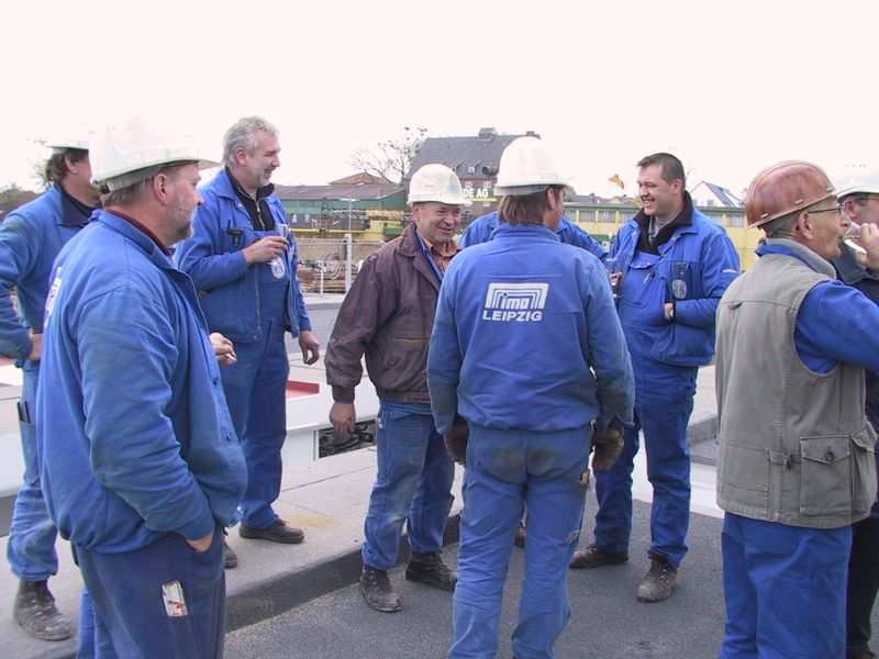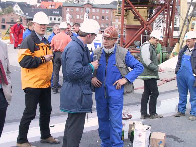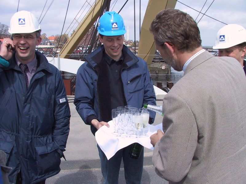 | 25.04.2002 - 13:35 Uhr - Kappeln/Schlei: Neubau einer Klappbrücke Einhängen der Klappen des nördlichen Klappenpaares C/D Zur Feier des Tages gibt es jetzt eine Runde Sekt für alle beteiligten Personen. Alle vier Brückenklappen wurden innerhalb von nur zwei Tagen eingehängt. Foto: Eckhard Schmidt - Kappeln - (C) 2002 |