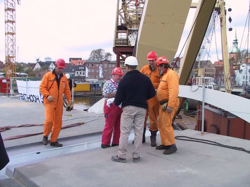 | 25.04.2002 - 13:30 Uhr - Kappeln/Schlei: Neubau einer Klappbrücke Einhängen der Klappen des nördlichen Klappenpaares C/D Bernd Löhden, Iwan de Coster und Mathias Paraknewitz im Gespräch in der Mitte des nördlichen Klappenpaares C/D. Foto: Eckhard Schmidt - Kappeln - (C) 2002 |