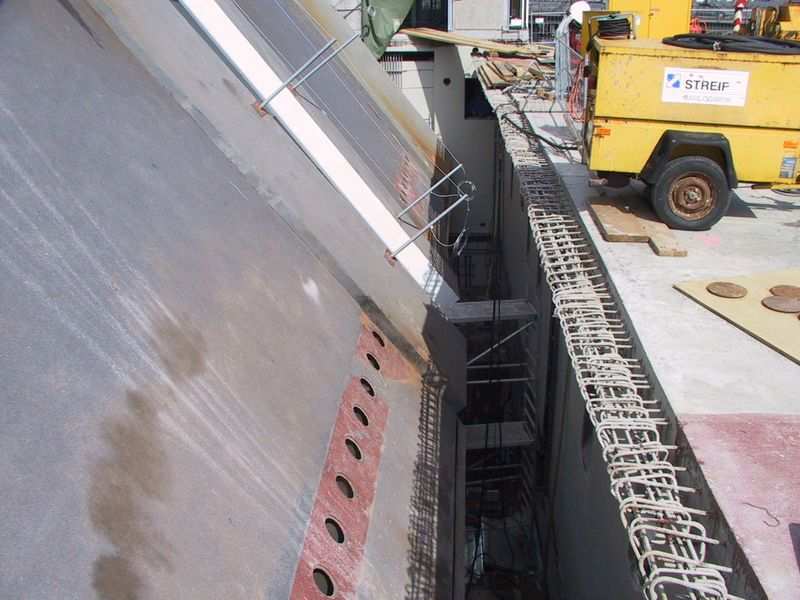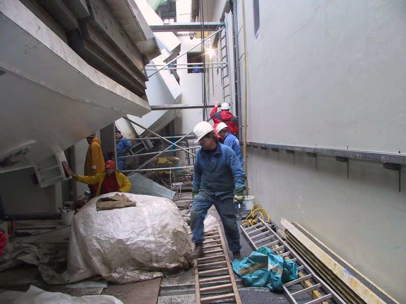 | 30.04.2002 -11:52 Uhr - Kappeln/Schlei: Neubau einer Klappbrücke Zum Erstenmal anheben aller vier Klappen Ich befinde mich im Klappenkeller des Pfeiler 40 und blicke vom Treppenhaus (Südende) auf den Rückarm der südlichen Ostklappe A/B. Monteure der Firmen imo-Leipzig und Robert Nyblad aus Papenburg beginnen sofort damit Arbeiten an den Rückarmen der Klappen auszuführen. Als erstes müssen am Boden des Klappenkellers die unteren Rollen der Rückarmverriegelungen genau fixiert werden, damit die Betonbauer der Firma HOCHTIEF die Fundamentplatten der Rollen heute noch einschalen und mit Pagel-Spezial-Beton vergießen können. Foto: Eckhard Schmidt - Kappeln - (C) 2002 |