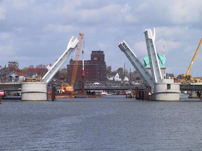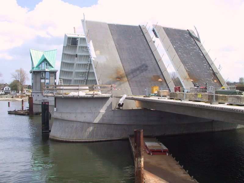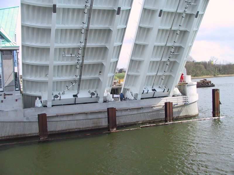 | 30.04.2002 -12:07 Uhr - Kappeln/Schlei: Neubau einer Klappbrücke Zum Erstenmal anheben aller vier Klappen Blick vom ASC-Yachthafen (Süden) in Richtung der Brückenbaustelle mit den angehoben Klappen. Die südliche Ostklappe A/B (rechts) dürfte jetzt voll (87,3 Grad) geöffnet sein, da die untere Rolle der Rückarmverriegelung eingestellt und fixiert werden soll. Im Hintergrund ist die Firma Ostseedienst gerade dabei südlich vom Pfeiler III der Drehbrücke zwei Stahldalben in den Schleigrund zu rammen. Die Holzdalben mussten dem Schwimmkran ROLAND weichen. Foto: Eckhard Schmidt - Kappeln - (C) 2002 |