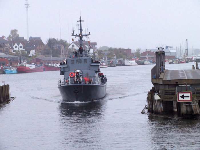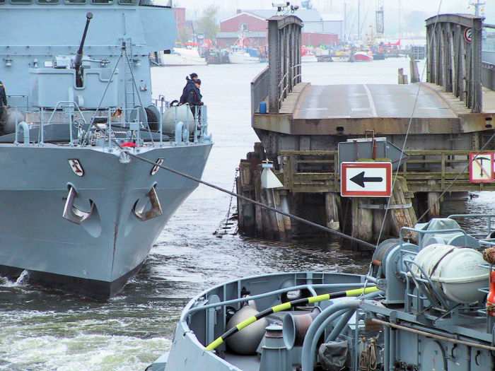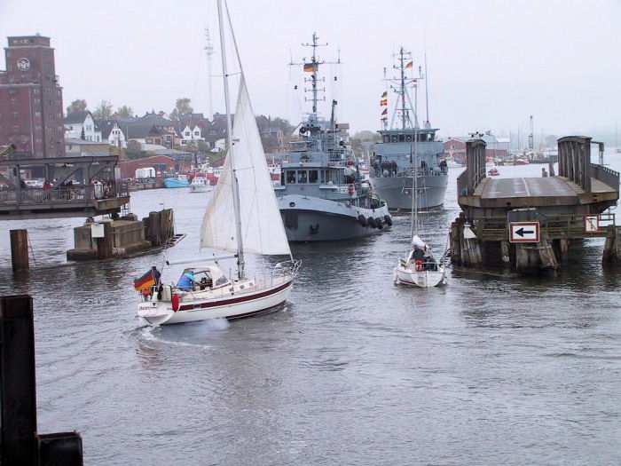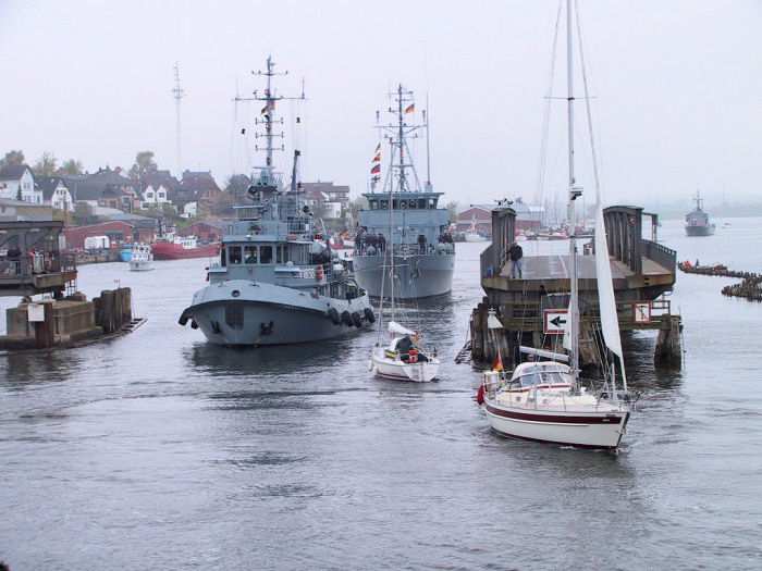 | 08.05.2002 - 13:52:05 Uhr - Kappeln/Schlei: Neubau einer Klappbrücke Marine-Schleppverband passiert die Brückenbaustelle in Richtung Südhafen Morgen beginnen in Kappeln die Heringstage 2002. Brückenöffnungszeit: 13:45 Uhr Von der Ostsee nähern sich das deutsche Minenjagdboot DILLINGEN - M 1065 und ein polnisches Minensuchboot Kappeln, um im Südhafen festzumachen. Die DILLINGEN wird von dem Schlepper WUSTROW geschleppt, da das deutsche Marineboot im letzten Jahr Probleme hatte die beiden Brücken zu passieren. Am Heck der DILLINGEN hängt noch das Motorboot AK 6 vom Marinearsenal Kiel. Zwei Segler versuchen noch die geöffnete Drehbrücke zu passieren. Sie können anscheinend von ihrer Position aus den Marine-Schleppverband nicht sehen. Unsere Zurufe Beidrehen" vom Pfeiler 50 aus haben beide Segler ignoriert. Lage der Schleibrücken (Dreh- und Klappbrücke) --- Zeichnung der Klappbrücke Bauphasen der Klappenpfeiler --- Visualisierung der Klappbrücke Foto: Eckhard Schmidt - Kappeln - (C) 2002 |