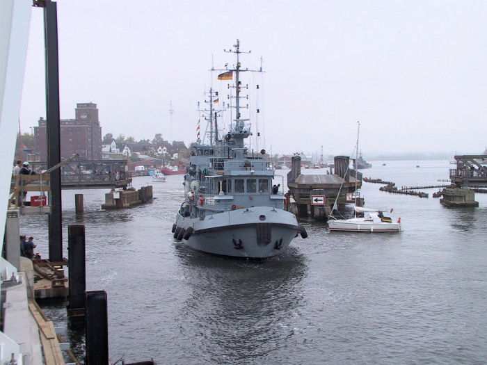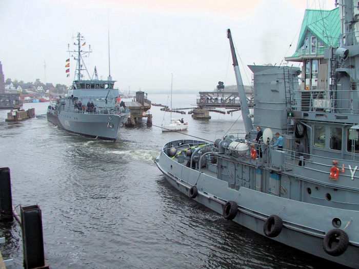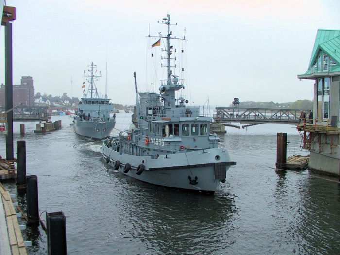 | 08.05.2002 - 13:54:14 Uhr - Kappeln/Schlei: Neubau einer Klappbrücke Marine-Schleppverband passiert die Brückenbaustelle in Richtung Südhafen Blick auf das Heck des Schleppers WUSTROW und den Bug des Minenjagdbootes DILLINGEN. Foto: Eckhard Schmidt - Kappeln - (C) 2002 |