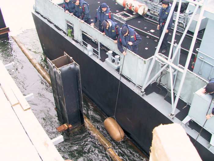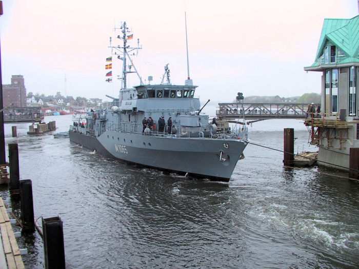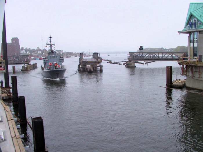 | 08.05.2002 - 14:02:15 Uhr - Kappeln/Schlei: Neubau einer Klappbrücke Marine-Schleppverband passiert die Brückenbaustelle in Richtung Südhafen Das polnische Minensuchboot passiert ohne Hilfe die Drehbrücke und die neue Klappbrücke. Foto: Eckhard Schmidt - Kappeln - (C) 2002 |