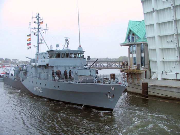 | 08.05.2002 - 13:55:05 Uhr - Kappeln/Schlei: Neubau einer Klappbrücke Marine-Schleppverband passiert die Brückenbaustelle in Richtung Südhafen Das Minenjagdboot DILLINGEN befindet sich jetzt bereits in der Durchfahrt der Klappbrücke. Foto: Eckhard Schmidt - Kappeln - (C) 2002 |