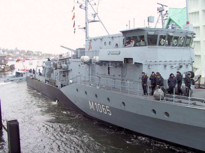 | 08.05.2002 - 13:54:55 Uhr - Kappeln/Schlei: Neubau einer Klappbrücke Marine-Schleppverband passiert die Brückenbaustelle in Richtung Südhafen Das Minenjagdboot DILLINGEN nähert sich der Durchfahrt der Klappbrücke. Foto: Eckhard Schmidt - Kappeln - (C) 2002 |
