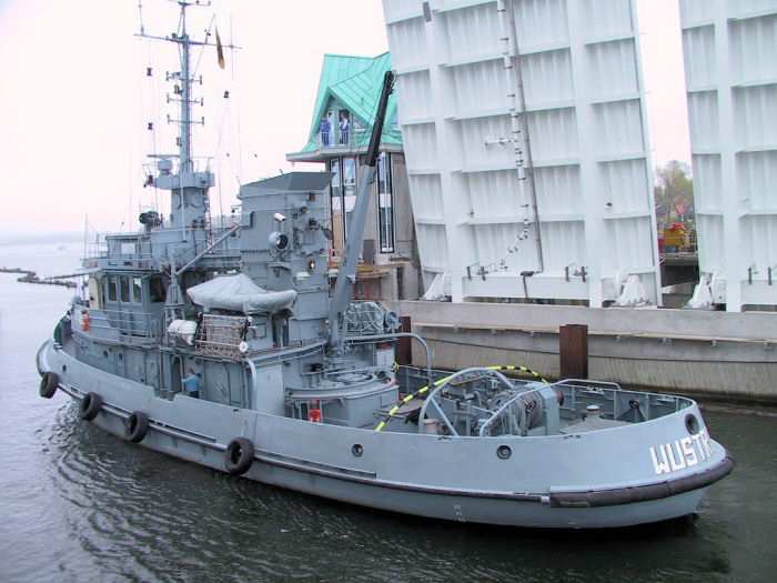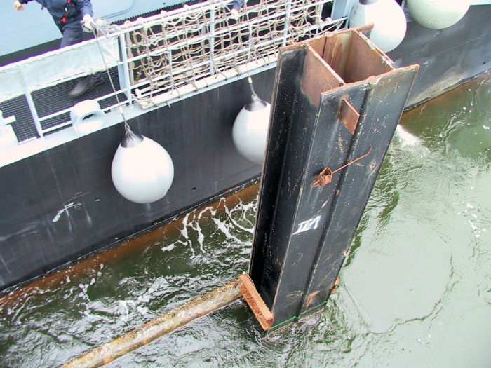 | 08.05.2002 - 14:02:32 Uhr - Kappeln/Schlei: Neubau einer Klappbrücke Marine-Schleppverband passiert die Brückenbaustelle in Richtung Südhafen Das polnische Minensuchboot passiert ohne Hilfe die Drehbrücke und die neue Klappbrücke. Foto: Eckhard Schmidt - Kappeln - (C) 2002 |