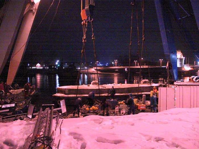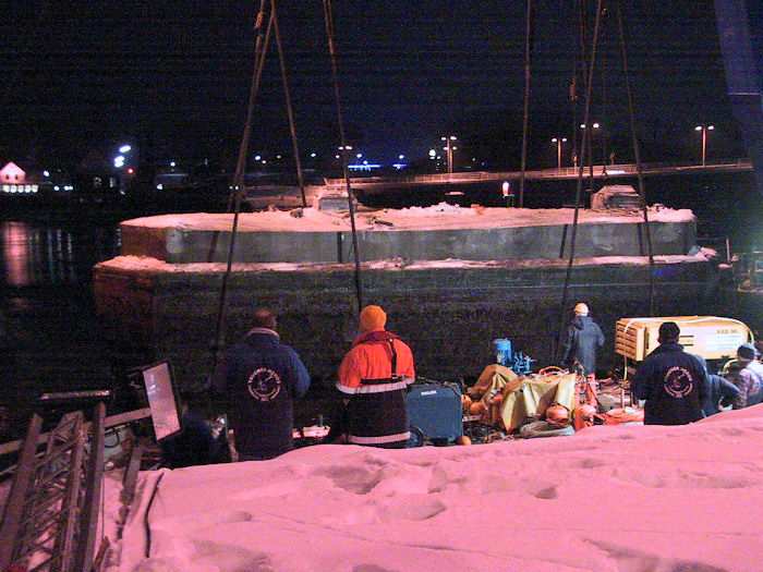 | 11.01.2003 - 19:23:14 Uhr - Kappeln/Schlei: Rückbau der Drehbrücke Pfeiler II: Kappen der Eisenbetonpfähle beendet - Anheben des Pfeilerkopfes Bauleiter Götz Heller von der Firma ECOSOIL hat mich telefonisch um etwa 18:45 Uhr informiert und so brauchte ich nicht die ganze Zeit in der Kälte herumstehen. Das Kappen der Eisenbetonpfähle ist beendet und der Pfeilerkopf wird langsam von den beiden Schwimmkränen TRITON und AMSTERDAM aus dem Wasser gezogen. Zustand vor und nach dem Rückbau Zeichnungen der Pfeiler I bis VI Gewichte der Pfeilerköpfe II / III und Überbauten 1 bis 4 Foto: Eckhard Schmidt - Kappeln - (C) 2003 |