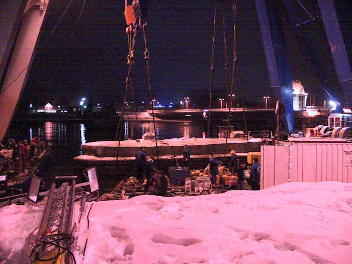 | 11.01.2003 - 19:34:53 Uhr - Kappeln/Schlei: Rückbau der Drehbrücke Pfeiler II: Kappen der Eisenbetonpfähle beendet - Anheben des Pfeilerkopfes Das Kappen der Eisenbetonpfähle ist beendet und der Pfeilerkopf wird langsam von den beiden Schwimmkränen TRITON und AMSTERDAM aus dem Wasser gezogen. Foto: Eckhard Schmidt - Kappeln - (C) 2003 |