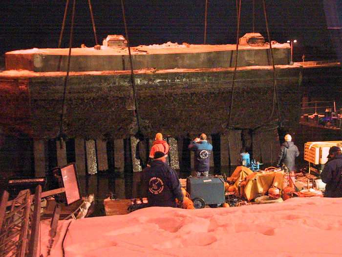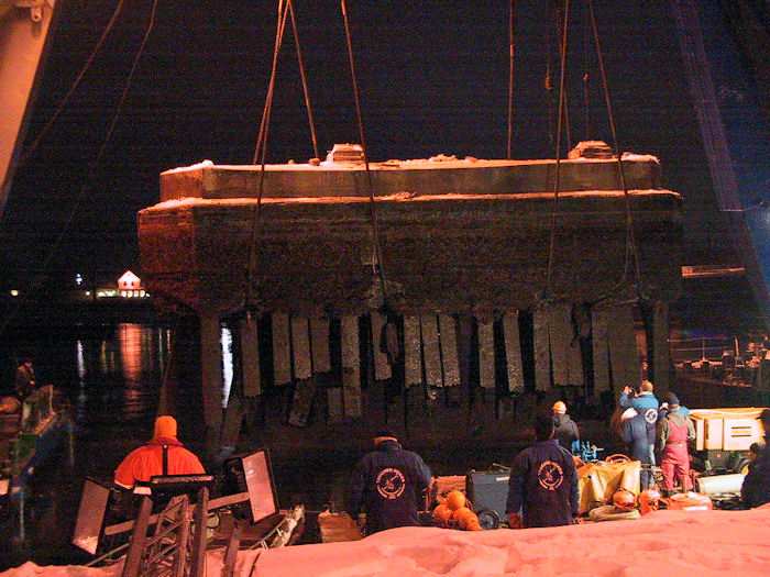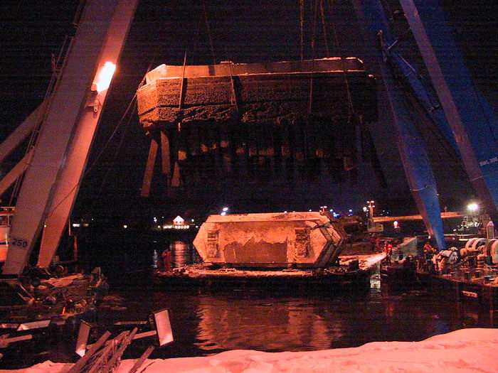 | 11.01.2003 - 19:36:48 Uhr - Kappeln/Schlei: Rückbau der Drehbrücke Pfeiler II: Kappen der Eisenbetonpfähle beendet - Anheben des Pfeilerkopfes Das Kappen der Eisenbetonpfähle ist beendet und der Pfeilerkopf wird langsam von den beiden Schwimmkränen TRITON und AMSTERDAM aus dem Wasser gezogen. Jetzt ist der Pfeilerkopf ganz aus dem Wasser heraus und man kann die Reste der Eisenbetonpfähle erkennen. Foto: Eckhard Schmidt - Kappeln - (C) 2003 |