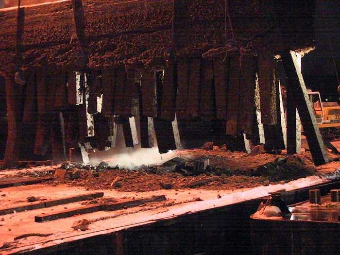 | 11.01.2003 - 19:38:49 Uhr - Kappeln/Schlei: Rückbau der Drehbrücke Pfeiler II: Kappen der Eisenbetonpfähle beendet - Anheben des Pfeilerkopfes Das Kappen der Eisenbetonpfähle ist beendet und der Pfeilerkopf wird langsam von den beiden Schwimmkränen TRITON und AMSTERDAM aus dem Wasser gezogen. Jetzt ist der Pfeilerkopf mit den Eisenbetonpfählen ganz aus dem Wasser heraus. Foto: Eckhard Schmidt - Kappeln - (C) 2003 |