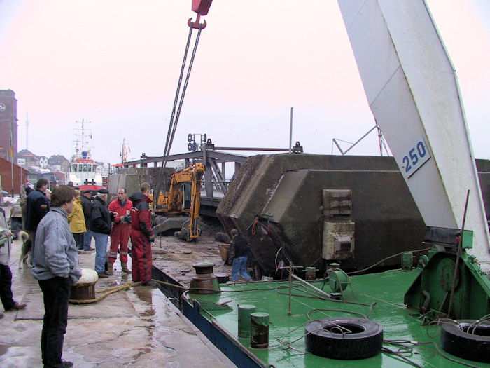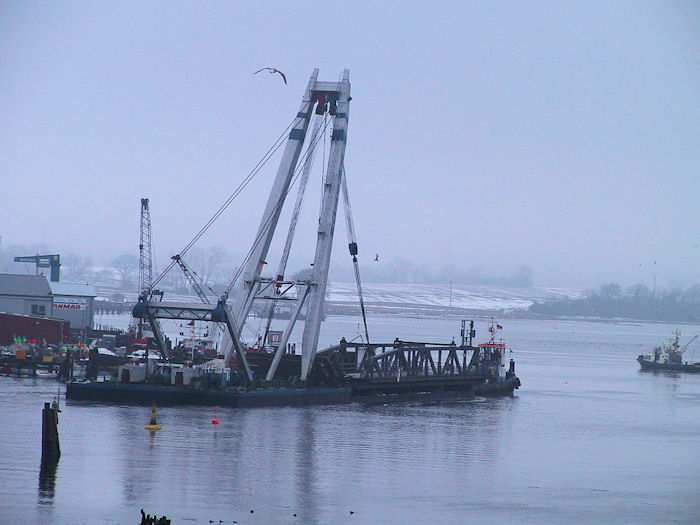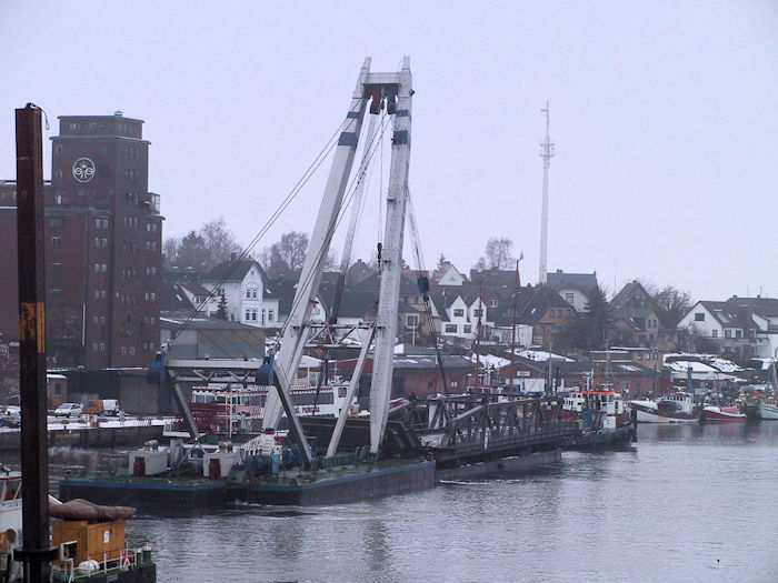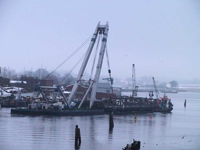 | 13.01.2003 - 11:01 Uhr - Kappeln/Schlei: Rückbau der Drehbrücke Schleppverband: Schlepper <-- Ponton BÄR <-- Schwimmkran TRITON Im Nordhafen wartet der Schleppverband bestehend aus einem Schlepper, dem Ponton BÄR und dem Schwimmkran TRITON auf den Lotsen, um nach Eckernförde auslaufen zu können. Im Vordergrund der Schwimmkran TRITON und dahinter der Ponton BÄR beladen mit dem Pfeilerkopf III, einem Bagger, dem Pfeilerkopf II und dem Überbau 4 (Ellenberg). Zustand vor und nach dem Rückbau Zeichnungen der Pfeiler I bis VI Gewichte der Pfeilerköpfe II / III und Überbauten 1 bis 4 Foto: Eckhard Schmidt - Kappeln - (C) 2003 |
