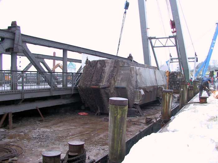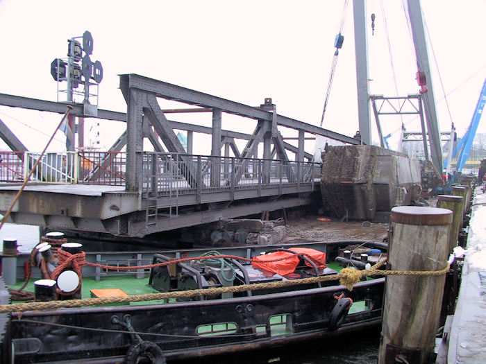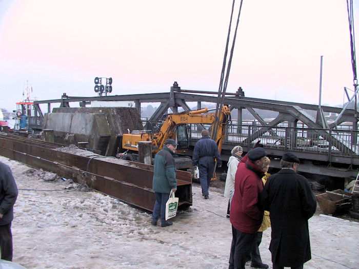 | 13.01.2003 - 11:02 Uhr - Kappeln/Schlei: Rückbau der Drehbrücke Schleppverband: Schlepper <-- Ponton BÄR <-- Schwimmkran TRITON Im Bild der Ponton BÄR mit dem Pfeilerkopf II, dem Bagger und dahinter dem Überbau 4 (Ellenberg). Der Pfeilerkopf III liegt weiter rechts (außerhalb des Bildes) quer auf dem Ponton BÄR. Foto: Eckhard Schmidt - Kappeln - (C) 2003 |