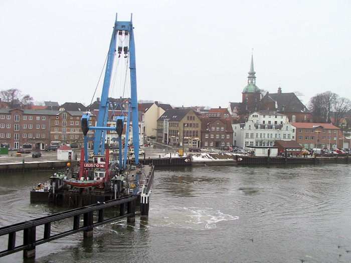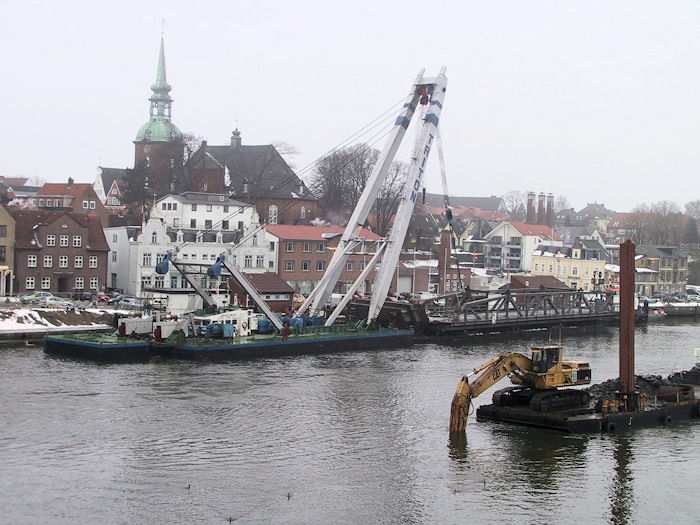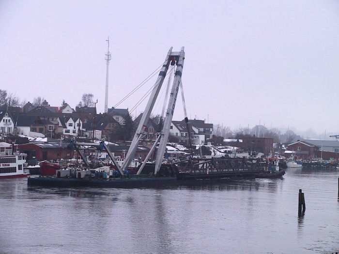 | 13.01.2003 - 11:38 Uhr - Kappeln/Schlei: Rückbau der Drehbrücke Schleppverband: Schlepper <-- Ponton BÄR <-- Schwimmkran TRITON Der Schleppverband auf dem Weg nach Eckernförde. Foto: Eckhard Schmidt - Kappeln - (C) 2003 |