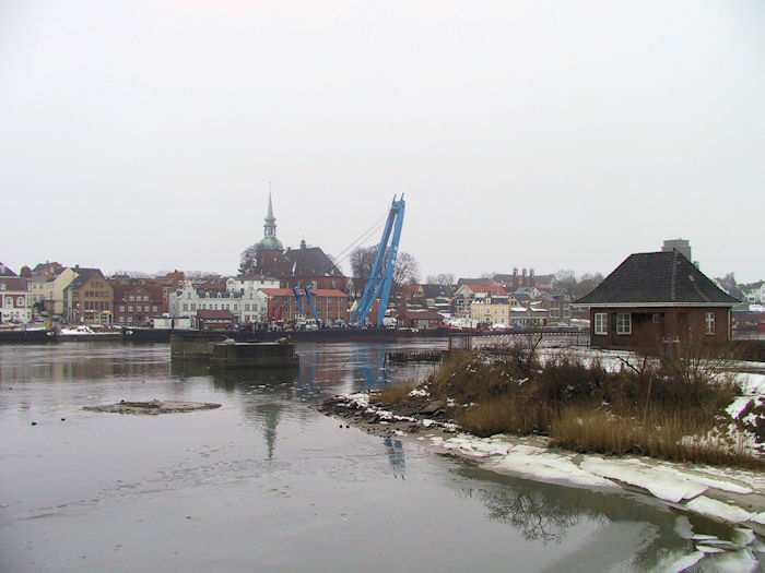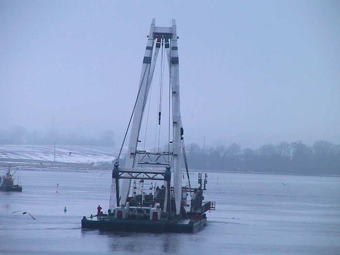 | 13.01.2003 - 11:37 Uhr - Kappeln/Schlei: Rückbau der Drehbrücke Schwimmkran AMSTERDAM Der Schwimmkran verlässt seinen Liegeplatz südlich vom Pfeiler I und wird am Liegeplatz des Schleppverbandes wieder festmachen. Foto: Eckhard Schmidt - Kappeln - (C) 2003 |