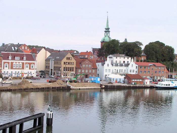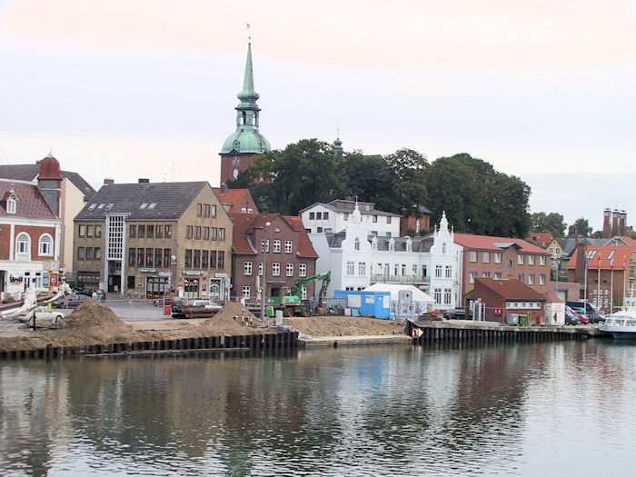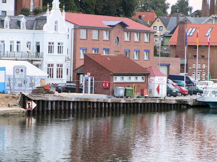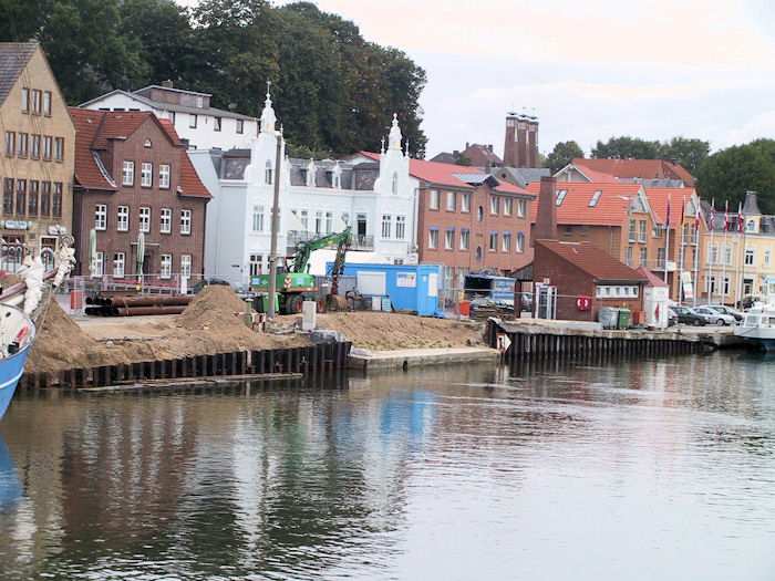 | 29.08.2003 - 8:06 Uhr - Kappeln/Schlei: Nordhafen Sanierung Kaiabschnitt 5 mit dem Pfeiler I der Drehbrücke Südliche Spundwand - Pfeiler I - Nördliche Spundwand Foto: Eckhard Schmidt - Kappeln - (C) 2003 |