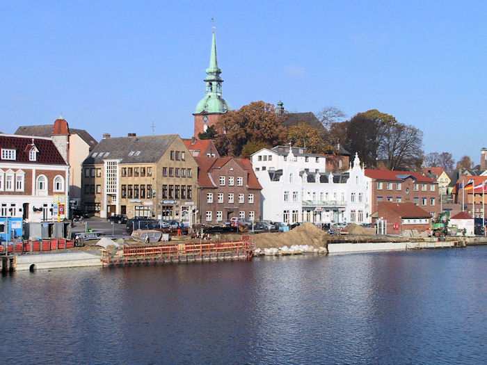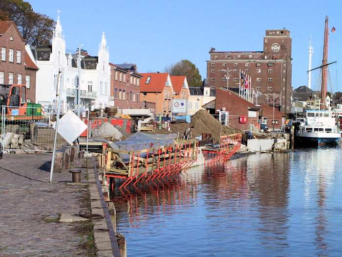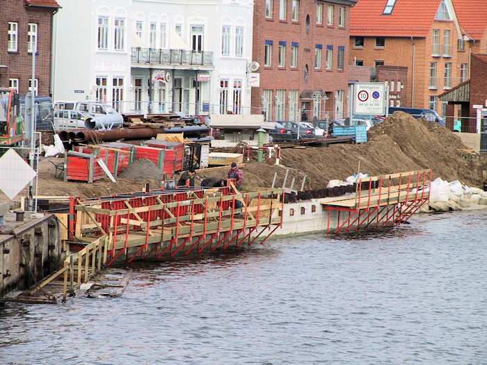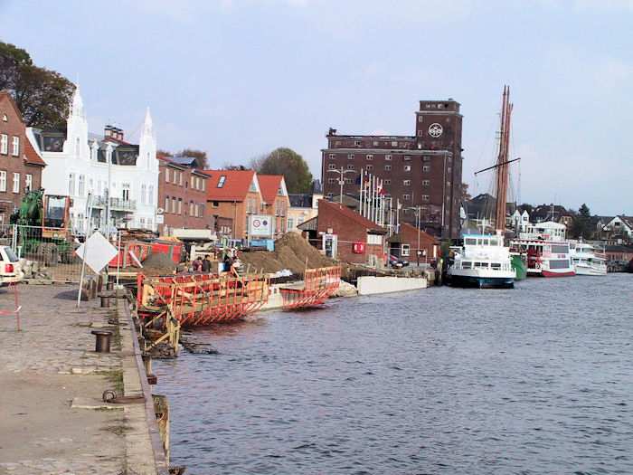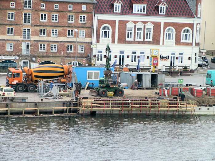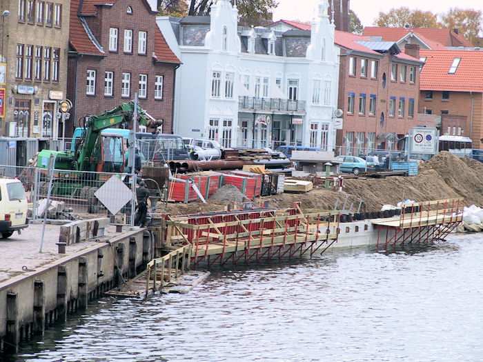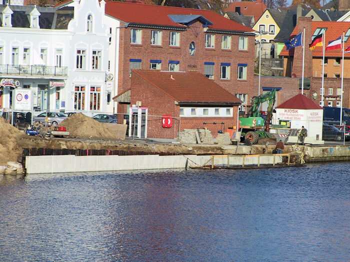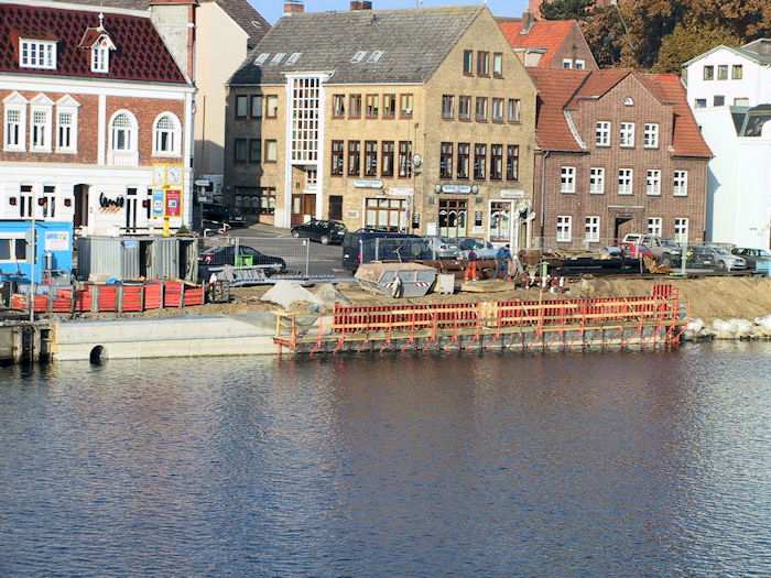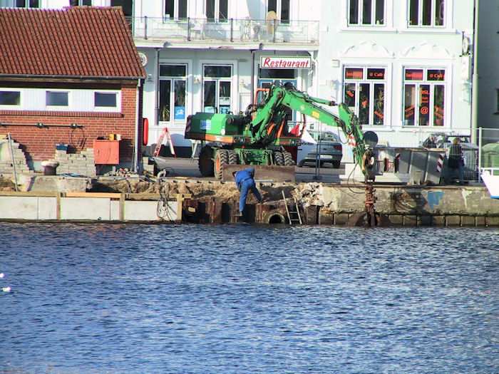 | 07.11.2003 - 10:24 Uhr - Kappeln/Schlei: Nordhafen Sanierung Kaiabschnitt 5 mit dem Pfeiler I der Drehbrücke Nördliche Spundwand Ansicht vom Kaiabschnitt 6 Foto: Eckhard Schmidt - Kappeln - (C) 2003 |