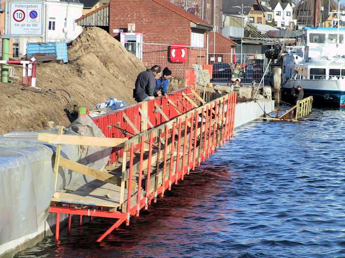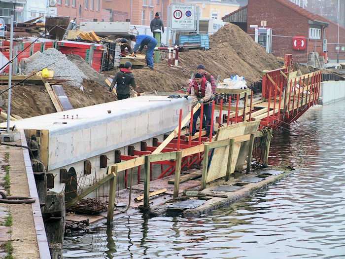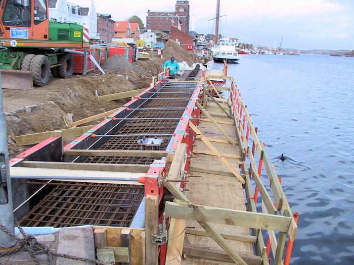 | 06.11.2003 - 10:17 Uhr - Kappeln/Schlei: Nordhafen Sanierung Kaiabschnitt 5 mit dem Pfeiler I der Drehbrücke Südliche Spundwand Beim Abschnitt 2 des Betonholms wurden die wasserseitigen Schalwände aufgestellt. Foto: Eckhard Schmidt - Kappeln - (C) 2003 |