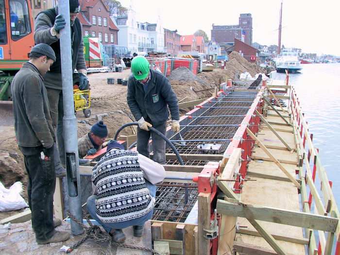 | 03.11.2003 - 13:12 Uhr - Kappeln/Schlei: Nordhafen Sanierung Kaiabschnitt 5 mit dem Pfeiler I der Drehbrücke Südliche Spundwand Die Mitarbeiter der Wasserbaufirma werden bei den Betonarbeiten durch einen Mitarbeiter der Baufirma Friedrich Holst aus Hamburg unterstützt. (Mitarbeiter mit grünem Helm) Foto: Eckhard Schmidt - Kappeln - (C) 2003 |
