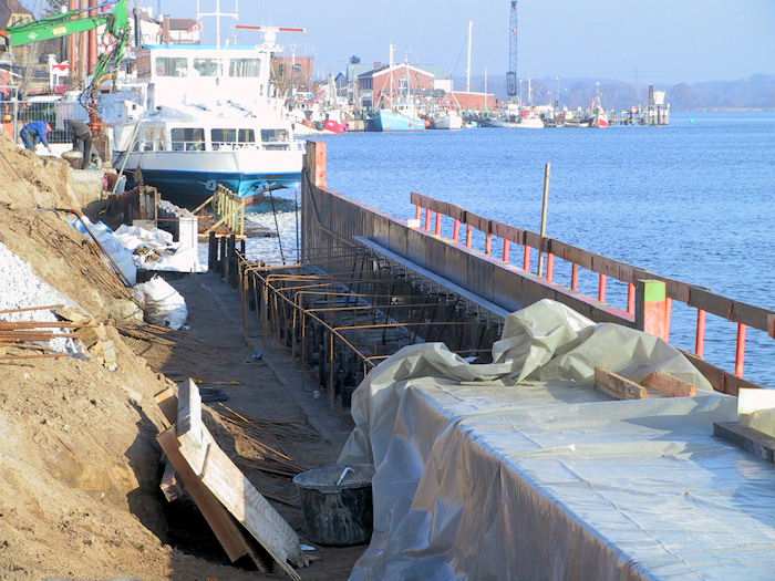 | 07.11.2003 - 10:17 Uhr - Kappeln/Schlei: Nordhafen Sanierung Kaiabschnitt 5 mit dem Pfeiler I der Drehbrücke Südliche Spundwand Beim Abschnitt 2 des Betonholms wird bereits die Bewehrung eingebracht. Foto: Eckhard Schmidt - Kappeln - (C) 2003 |