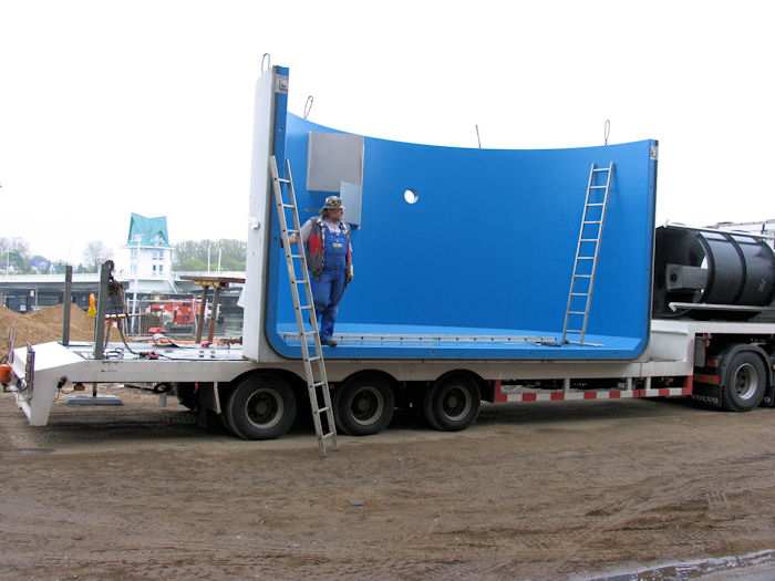 | 11.05.2004 - 9:15 Uhr - Kappeln/Schlei: Nordhafen Umgestaltung des Hafenvorfeldes: Schleibrücke / Hohlweg bis Fährberg Am Hafen - Einbau eines Regenwasserklärbeckens Die erste Hälfte des Beckens wird langsam in die Baugrube abgesenkt. Links (kleine Öffnung): Ablauf Regenwasser Rechts (große Öffnung): Zulauf Regenwasser Foto: Eckhard Schmidt - Kappeln - (C) 2004 |
