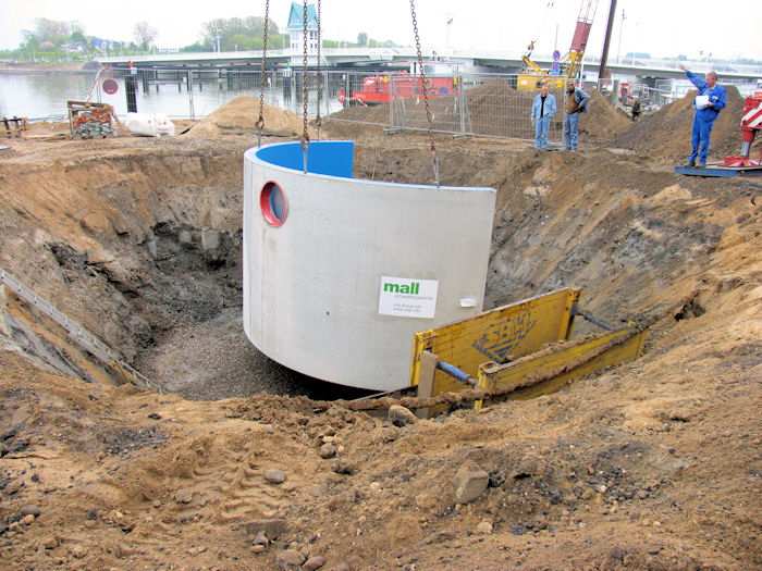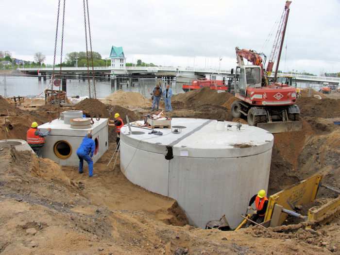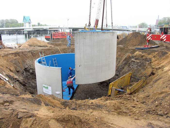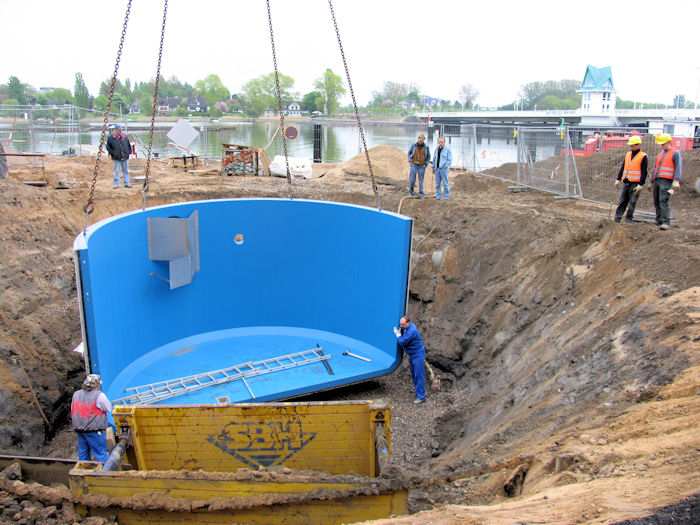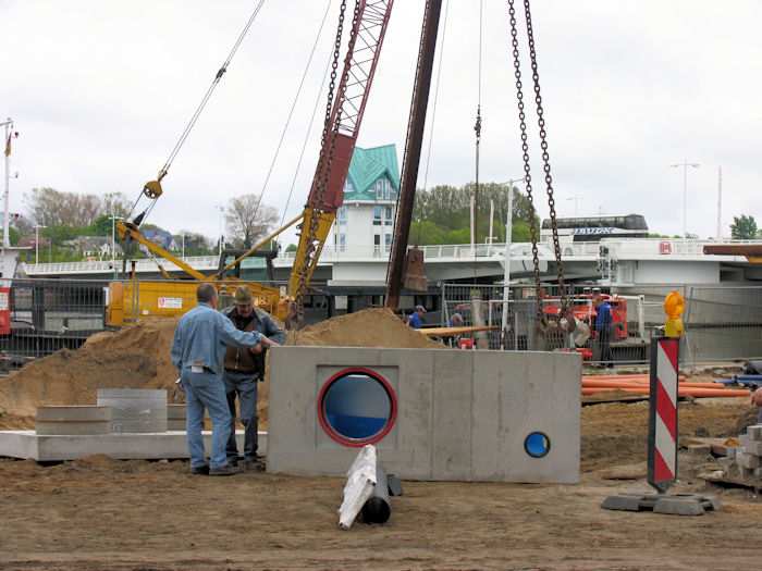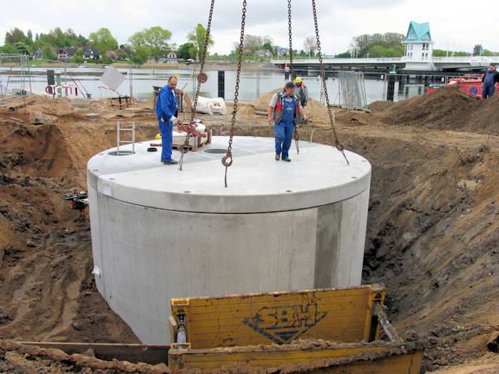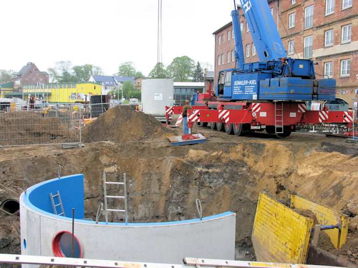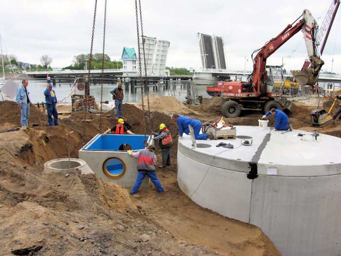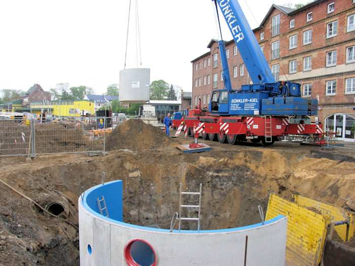 | 11.05.2004 - 11:17 Uhr - Kappeln/Schlei: Nordhafen Umgestaltung des Hafenvorfeldes: Schleibrücke / Hohlweg bis Fährberg Am Hafen - Einbau eines Regenwasserklärbeckens Das kleine Becken hängt bereits an den Ketten des Autokranes. Links im Bild (große Öffnung): Verbindung mit Zulauf des Regenwasserklärbeckens Rechts im Bild hinter Überlauf (kleine Öffnung): Verbindung mit Ablauf des Regenwasserklärbeckens Foto: Eckhard Schmidt - Kappeln - (C) 2004 |
