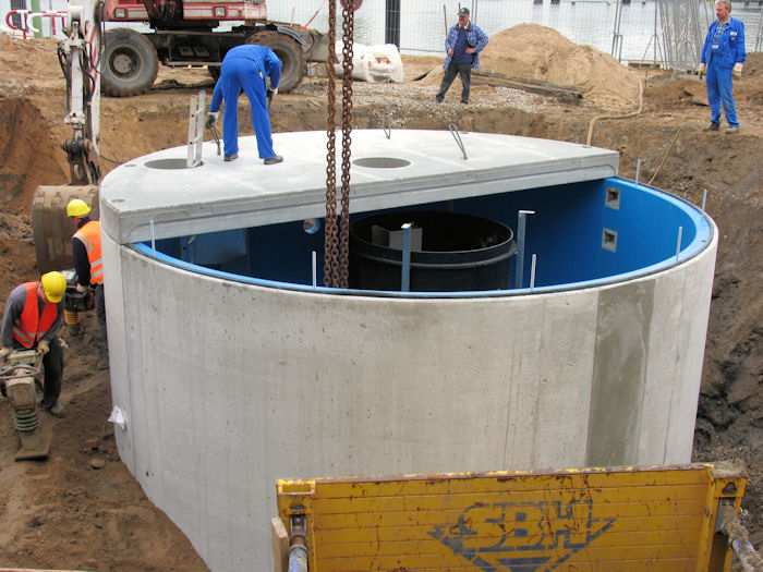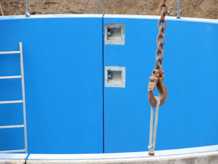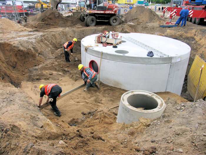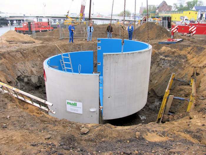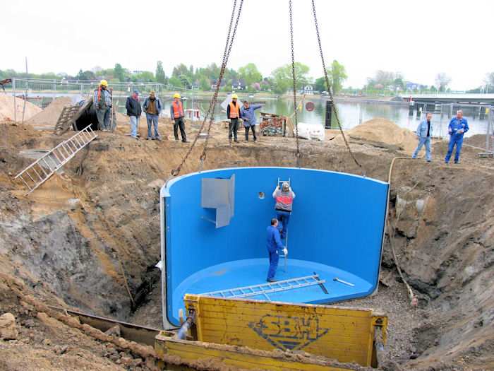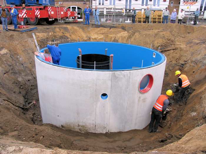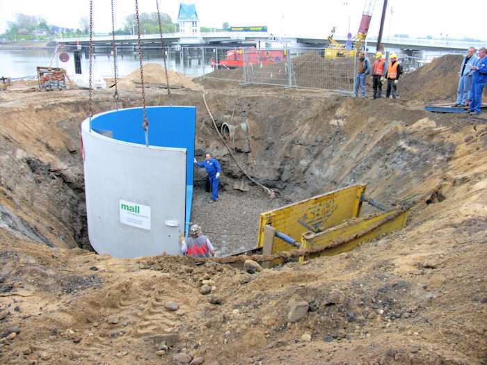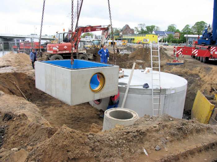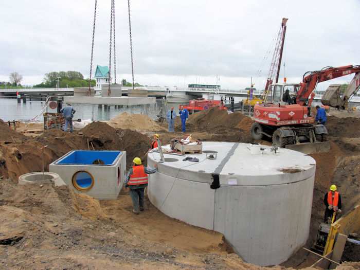 | 11.05.2004 - 11:17 Uhr - Kappeln/Schlei: Nordhafen Umgestaltung des Hafenvorfeldes: Schleibrücke / Hohlweg bis Fährberg Am Hafen - Einbau eines Regenwasserklärbeckens Das kleine Becken hängt bereits an den Ketten des Autokranes. Links im Bild (große Öffnung): Verbindung mit Zulauf des Regenwasserklärbeckens Rechts im Bild hinter Überlauf (kleine Öffnung): Verbindung mit Ablauf des Regenwasserklärbeckens Foto: Eckhard Schmidt - Kappeln - (C) 2004 |