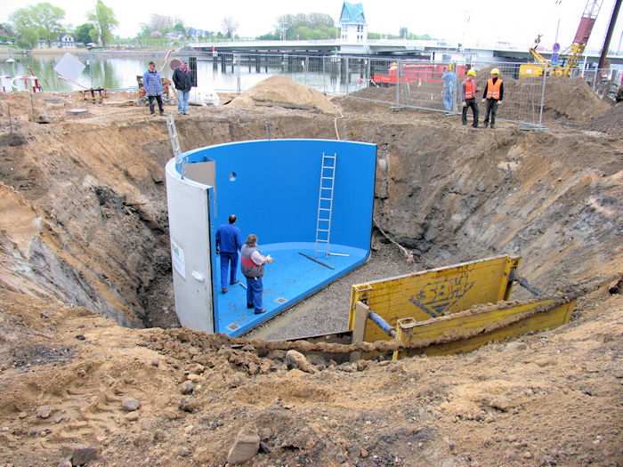 | 11.05.2004 - 11:59 Uhr - Kappeln/Schlei: Nordhafen Umgestaltung des Hafenvorfeldes: Schleibrücke / Hohlweg bis Fährberg Am Hafen - Einbau eines Regenwasserklärbeckens Das kleine Becken steht jetzt in der richtigen Position zum großen Regenwasserklärbecken. Foto: Eckhard Schmidt - Kappeln - (C) 2004 |