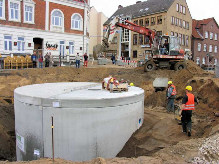 | 11.05.2004 - 10:19 Uhr - Kappeln/Schlei: Nordhafen Umgestaltung des Hafenvorfeldes: Schleibrücke / Hohlweg bis Fährberg Am Hafen - Einbau eines Regenwasserklärbeckens In der Mitte des Beckens wurde ein schwarzer Zylinder aufgestellt. Foto: Eckhard Schmidt - Kappeln - (C) 2004 |