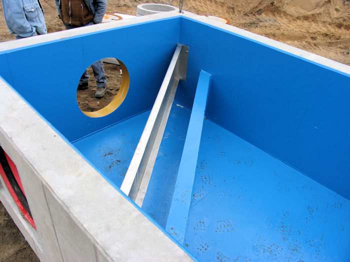 | 11.05.2004 - 11:16 Uhr - Kappeln/Schlei: Nordhafen Umgestaltung des Hafenvorfeldes: Schleibrücke / Hohlweg bis Fährberg Am Hafen - Einbau eines Regenwasserklärbeckens Das kleine Betonbecken für den Ein- und Ablauf sowie mit einem zusätzlichen Überlauf des Regenwassers. Oben im Bild: Zulauf des Regenwassers Links im Bild (große Öffnung): Verbindung mit Zulauf des Regenwasserklärbeckens Wände schräg im Becken: Überlauf Bei viel Regen strömt ein Teil des Regens am Regenwasserbecken vorbei in Richtung Schlei. Links im Bild hinter Überlauf (kleine Öffnung, nicht sichtbar): Verbindung mit Ablauf des Regenwasserklärbeckens Unten im Bild: Ablauf des Regenwassers Foto: Eckhard Schmidt - Kappeln - (C) 2004 |