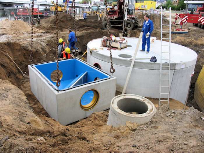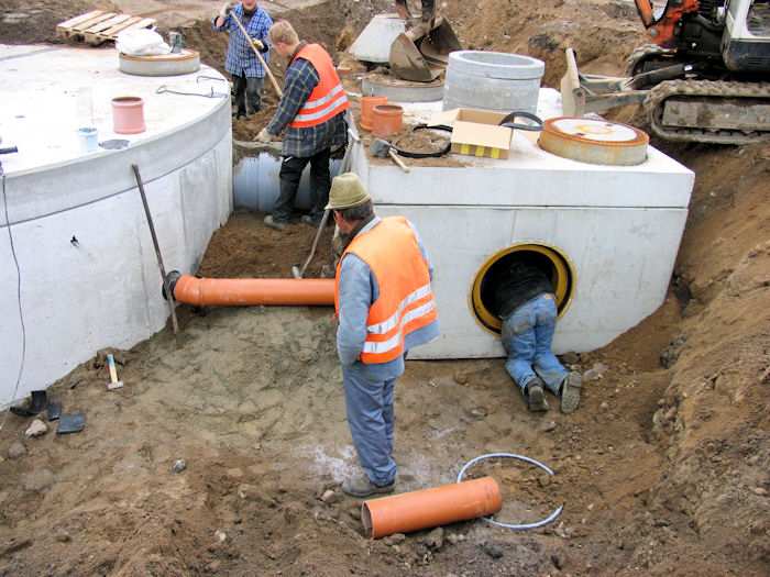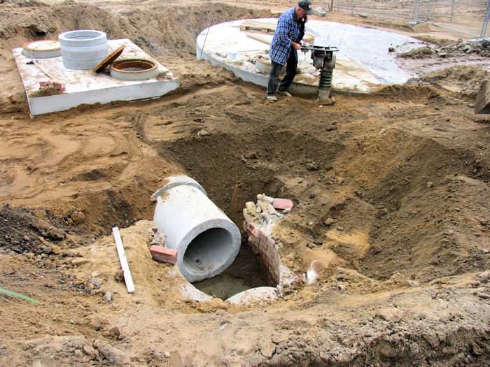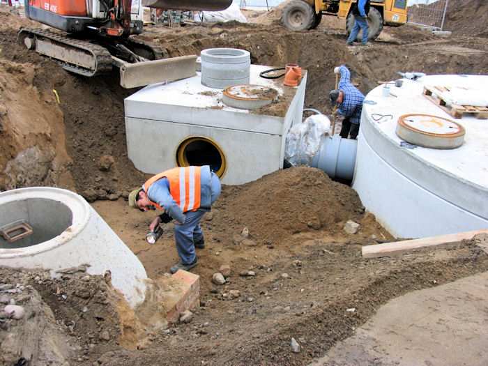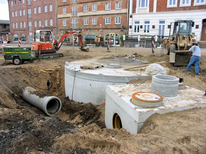 | 13.05.2004 - 9:08 Uhr - Kappeln/Schlei: Nordhafen Umgestaltung des Hafenvorfeldes: Schleibrücke / Hohlweg bis Fährberg Am Hafen Das Regenwasserklärbecken (links) wurde per Rohrleitungen mit dem kleinen Becken verbunden. Großes Rohr (grau): Zulauf -- Kleines Rohr (rot): Ablauf. Foto: Eckhard Schmidt - Kappeln - (C) 2004 |