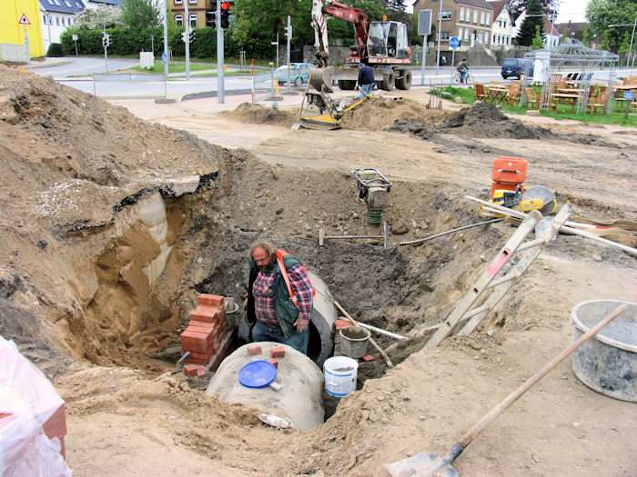 | 13.05.2004 - 15:16 Uhr - Kappeln/Schlei: Nordhafen Umgestaltung des Hafenvorfeldes: Schleibrücke / Hohlweg bis Fährberg Am Hafen Regenwasserleitung: Hohlweg -> Am Hafen -> Schlei Es wird gerade der Schacht in der Lücke der Leitung aufgemauert. Es ist der zweite Schacht von der Schlei aus gesehen. Der Schacht muss morgen fertig gestellt werden, da die Straße wieder für den Verkehr freigegeben werden soll. Foto: Eckhard Schmidt - Kappeln - (C) 2004 |