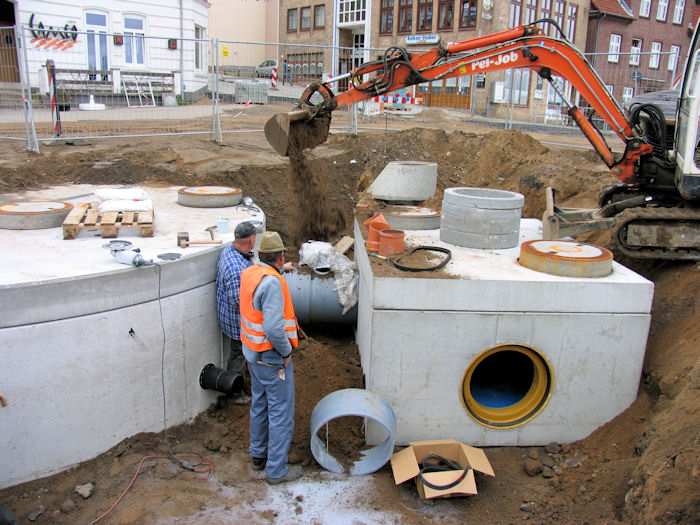 | 14.05.2004 - 11:27 Uhr - Kappeln/Schlei: Nordhafen Umgestaltung des Hafenvorfeldes: Schleibrücke / Hohlweg bis Fährberg Am Hafen Regenwasserklärbecken Das Ablaufrohr wird in Richtung kleines Becken verlegt. Foto: Eckhard Schmidt - Kappeln - (C) 2004 |