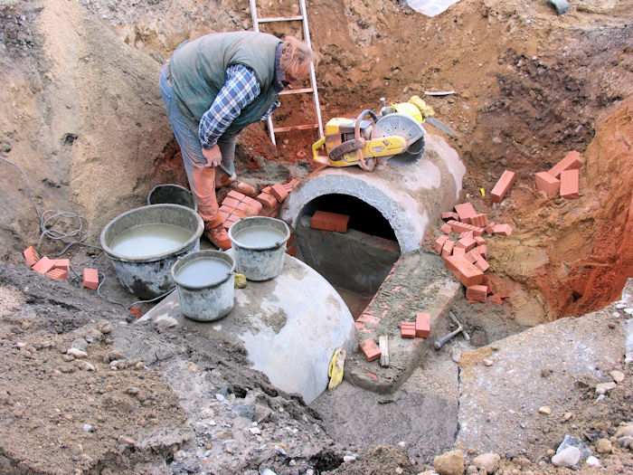 | 13.05.2004 - 14:52 Uhr - Kappeln/Schlei: Nordhafen Umgestaltung des Hafenvorfeldes: Schleibrücke / Hohlweg bis Fährberg Am Hafen Regenwasserleitung: Hohlweg -> Am Hafen -> Schlei Es wird gerade der Schacht in der Lücke der Leitung aufgemauert. Es ist der zweite Schacht von der Schlei aus gesehen. Das Schleiwasser wird durch die provisorische Mauer in dem Ablaufrohr (oben) aufgehalten. Foto: Eckhard Schmidt - Kappeln - (C) 2004 |