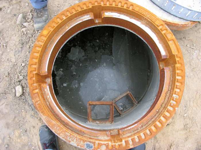 | 13.05.2004 - 14:49 Uhr - Kappeln/Schlei: Nordhafen Umgestaltung des Hafenvorfeldes: Schleibrücke / Hohlweg bis Fährberg Am Hafen Regenwasserleitung: Hohlweg -> Am Hafen -> Schlei Das Wasser im ersten Schacht von der Schlei aus gesehen steigt langsam an, der der Schachtmeister den Ballon im Ablaufrohr zur Schlei entlüftet hat. Foto: Eckhard Schmidt - Kappeln - (C) 2004 |