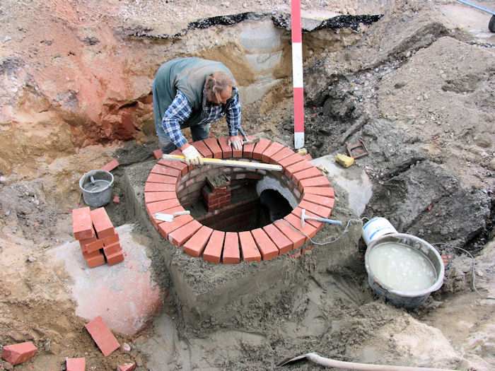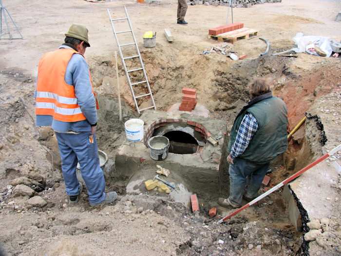 | 14.05.2004 - 11:28 Uhr - Kappeln/Schlei: Nordhafen Umgestaltung des Hafenvorfeldes: Schleibrücke / Hohlweg bis Fährberg Am Hafen Regenwasserklärbecken Der Schacht im Zulaufrohr am unteren Fährberg wird fertig aufgemauert. Foto: Eckhard Schmidt - Kappeln - (C) 2004 |