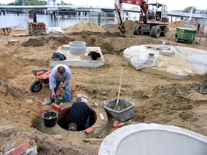 | 12.05.2004 - 14:24 Uhr - Kappeln/Schlei: Nordhafen Umgestaltung des Hafenvorfeldes: Schleibrücke / Hohlweg bis Fährberg Am Hafen Regenwasserleitung: Hohlweg -> Am Hafen -> Schlei Es wird gerade der Schacht in der Lücke der Leitung aufgemauert. Es ist der zweite Schacht von der Schlei aus gesehen. Foto: Eckhard Schmidt - Kappeln - (C) 2004 |