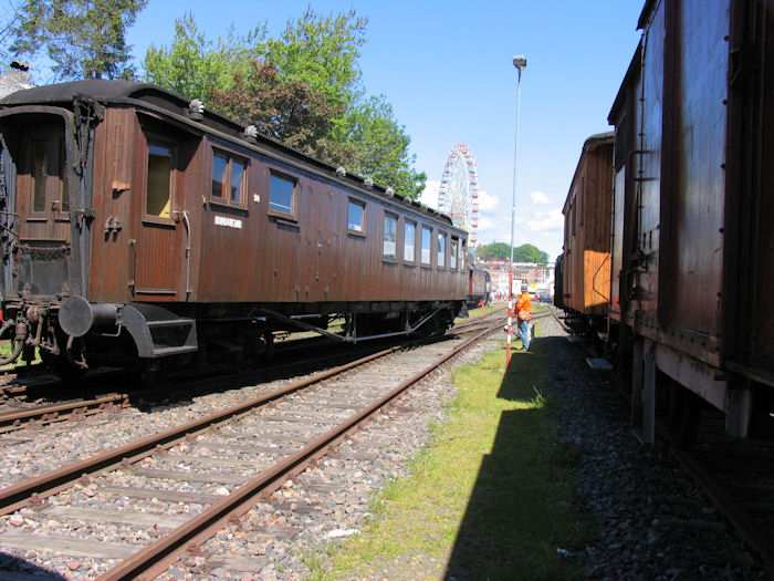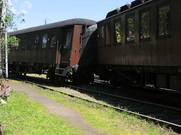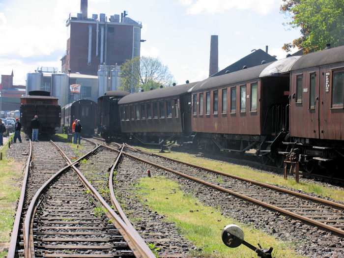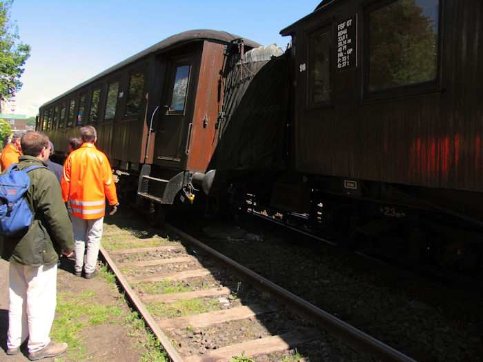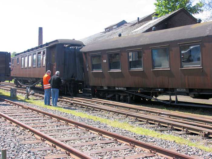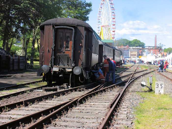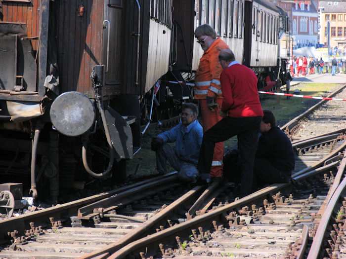 | 23.05.2004 - 11:57 Uhr - Kappeln/Schlei: Heringstage 2004 Museumsbahn: Personenwagen beim Rangieren entgleist Beim Rangieren ist von vier Wagen der vorletzte Wagen aus den Schienen gesprungen. Foto: Eckhard Schmidt - Kappeln - (C) 2004 |