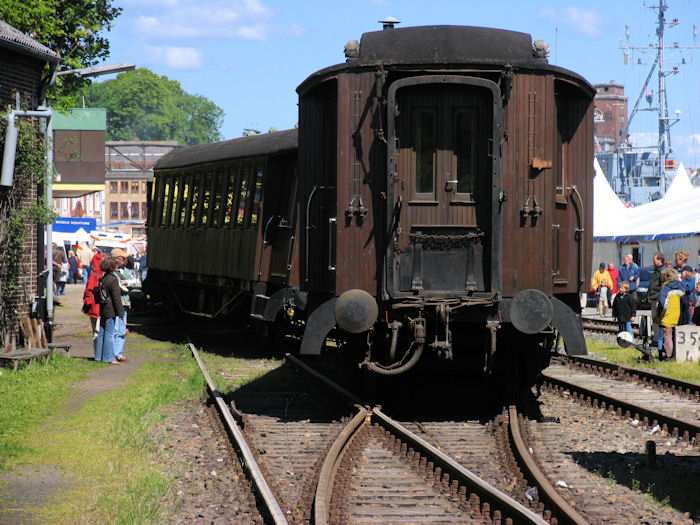 | 23.05.2004 - 12:06 Uhr - Kappeln/Schlei: Heringstage 2004 Museumsbahn: Personenwagen beim Rangieren entgleist Links: Der entgleiste Wagen auf dem Gleis 1 Rechts: Der letzte Wagen auf dem Gleis 2 Foto: Eckhard Schmidt - Kappeln - (C) 2004 |