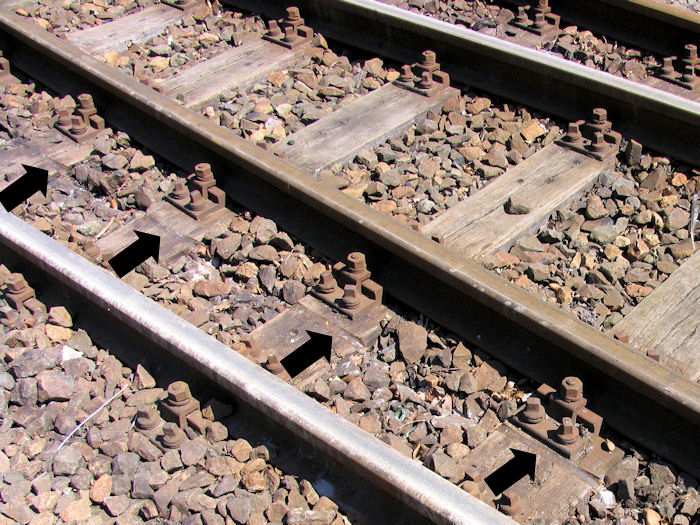 | 23.05.2004 - 12:12 Uhr - Kappeln/Schlei: Heringstage 2004 Museumsbahn: Personenwagen beim Rangieren entgleist In den Holz-Schwellen sind die Spuren der Räder des aus den Schienen gesprungenen Radsatzes vom vorletzten Wagen gut zu erkennen. Foto: Eckhard Schmidt - Kappeln - (C) 2004 |
