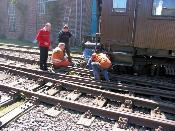 | 23.05.2004 - 14:58 Uhr - Kappeln/Schlei: Heringstage 2004 Museumsbahn: Personenwagen beim Rangieren entgleist Die Museumsbahner versuchen vergeblich den vorletzten Wagen per Wagenheber auf die Schienen von Gleis 1 zu setzen. Morgen soll der Wagen mit Hilfe eines Kranes wieder auf das Gleis 1 gesetzt werden. Foto: Eckhard Schmidt - Kappeln - (C) 2004 |