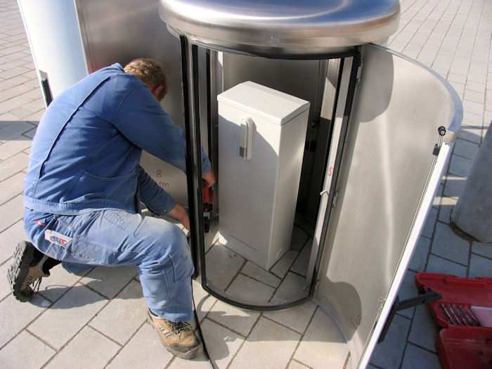 | 27.09.2004 - 10:27 Uhr - Kappeln/Schlei: Nordhafen Umgestaltung des Hafenvorfeldes: Schleibrücke / Hohlweg bis Fährberg Am Hafen Bei drei Straßenlampen werden je zwei Stromverteilerkästen gesetzt. Es wird gerade ein Leergehäuse über den EON-Hanse-Verteilerkasten gestülpt. Foto: Eckhard Schmidt - Kappeln - (C) 2004 |