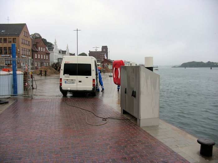 | 29.09.2004 - 8:49 Uhr - Kappeln/Schlei: Nordhafen Umgestaltung des Hafenvorfeldes: Schleibrücke / Hohlweg bis Fährberg Am Hafen Ein Messwagen von EON-Hanse hat sein Messkabel an ein defektes Kabel angeschlossen. Das Einspeisekabel für den Stromverteilerkasten nahe der Unterführung hat einen Erdschluss. Foto: Eckhard Schmidt - Kappeln - (C) 2004 |