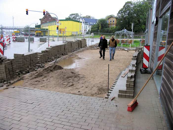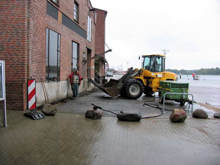 | 29.09.2004 - 10:29 Uhr - Kappeln/Schlei: Nordhafen Umgestaltung des Hafenvorfeldes: Schleibrücke / Hohlweg bis Fährberg Am Hafen Momentan regnet es in Kappeln stark. Das restliche Pflaster vor den Tonnendachhäusern ist bereits komplett hochgenommen und kann nach Anpassung des Untergrundes neu verlegt werden. Foto: Eckhard Schmidt - Kappeln - (C) 2004 |