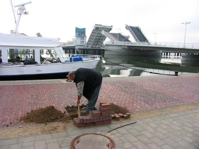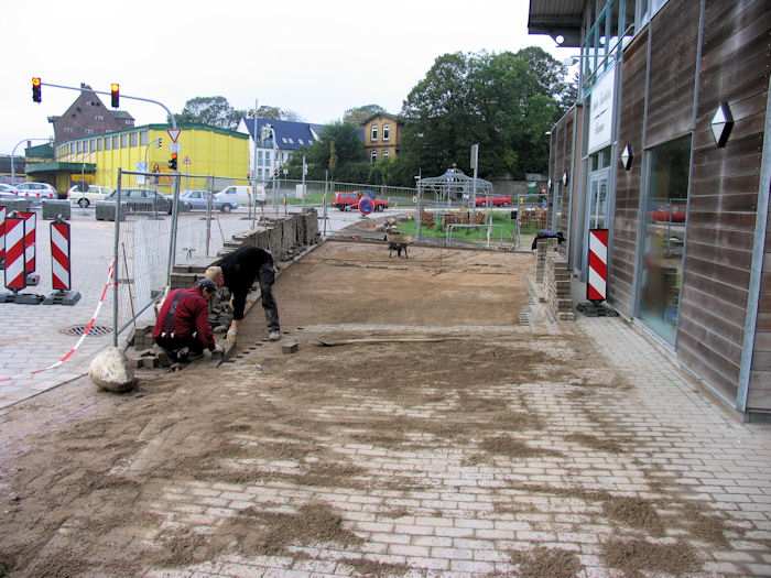 | 30.09.2004 - 8:42 Uhr - Kappeln/Schlei: Nordhafen Umgestaltung des Hafenvorfeldes: Schleibrücke / Hohlweg bis Fährberg Am Hafen Viktor und Kai verlegen Betonsteine vor den Tonnendachhäusern. Foto: Eckhard Schmidt - Kappeln - (C) 2004 |