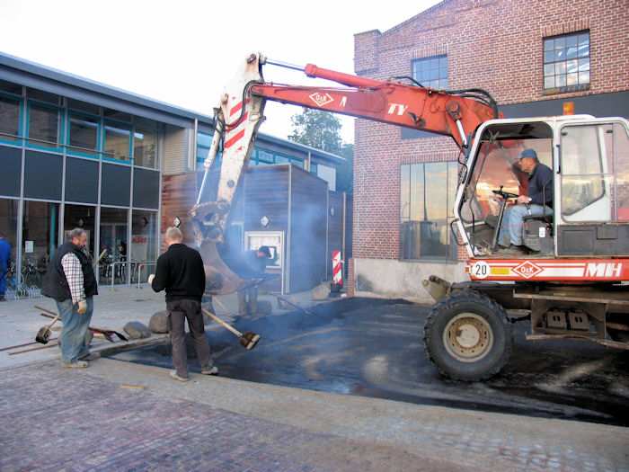 | 29.09.2004 - 10:30 Uhr - Kappeln/Schlei: Nordhafen Umgestaltung des Hafenvorfeldes: Schleibrücke / Hohlweg bis Fährberg Am Hafen Vor dem Architekturbüro wird doch noch ein Teil des alten Asphalts mit dem darunter liegenden Pflaster entfernt, damit die neue Asphaltdecke etwas stärker ausfällt. Foto: Eckhard Schmidt - Kappeln - (C) 2004 |