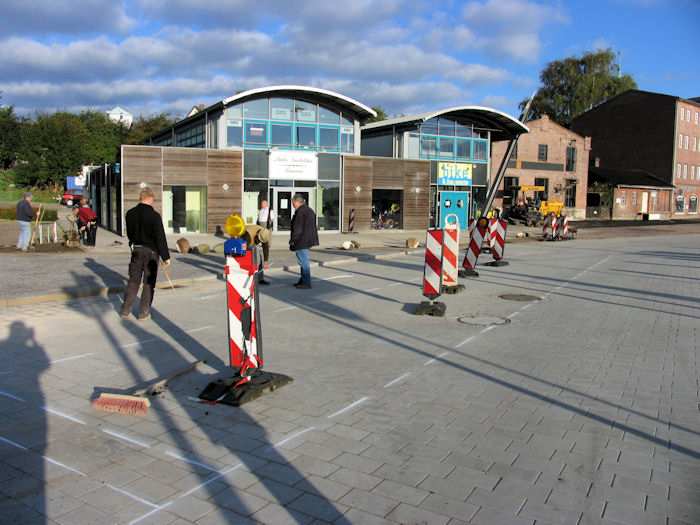 | 01.10.2004 - 10:55 Uhr - Kappeln/Schlei: Nordhafen Umgestaltung des Hafenvorfeldes: Schleibrücke / Hohlweg bis Fährberg Am Hafen Die Fläche vor den beiden Häusern ist fertig asphaltiert. Foto: Eckhard Schmidt - Kappeln - (C) 2004 |