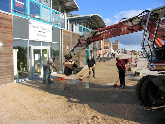 | 01.10.2004 - 9:48 Uhr - Kappeln/Schlei: Nordhafen Umgestaltung des Hafenvorfeldes: Schleibrücke / Hohlweg bis Fährberg Am Hafen Vor den Tonnendachhäusern wird das Betonpflaster mit Sand eingeschlämmt. Wasser holt Walter mit seinem Bagger aus der Schlei. Foto: Eckhard Schmidt - Kappeln - (C) 2004 |