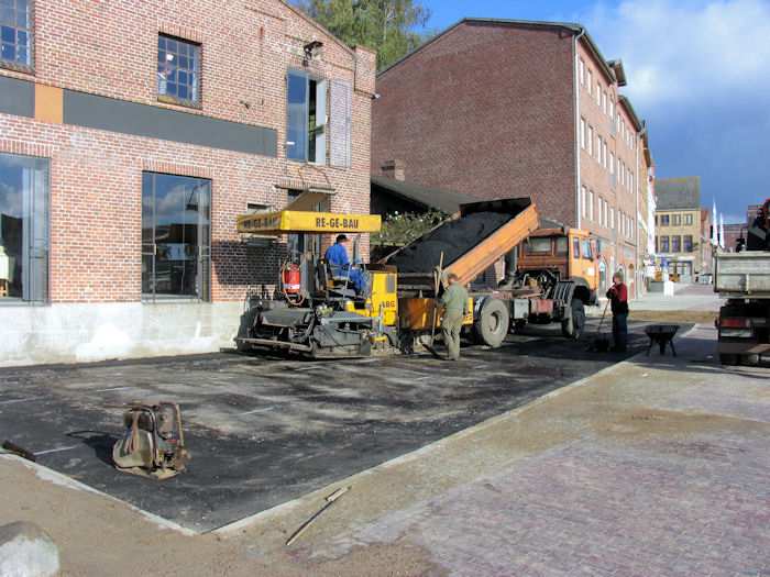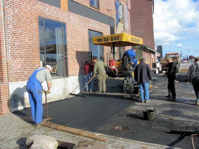 | 27.09.2004 - 10:20 Uhr - Kappeln/Schlei: Nordhafen Umgestaltung des Hafenvorfeldes: Schleibrücke / Hohlweg bis Fährberg Am Hafen Bei einigen Häusern muss die vorhandene Asphaltschicht durch den Einbau einer zusätzlichen Asphaltdecke in der Höhe an das neu verlegte Pflaster angepasst werden. Foto: Eckhard Schmidt - Kappeln - (C) 2004 |