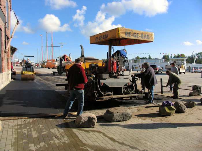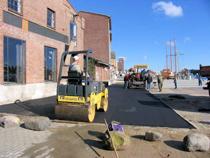 | 01.10.2004 - 10:30 Uhr - Kappeln/Schlei: Nordhafen Umgestaltung des Hafenvorfeldes: Schleibrücke / Hohlweg bis Fährberg Am Hafen Der Fertiger hat neu angesetzt, um den zweiten von drei Streifen zu asphaltieren. Foto: Eckhard Schmidt - Kappeln - (C) 2004 |